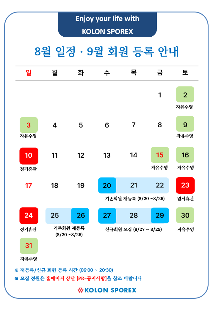 ∙ 기존회원 재등록 : 8월 20일(수) ~ 8월 26일(화)