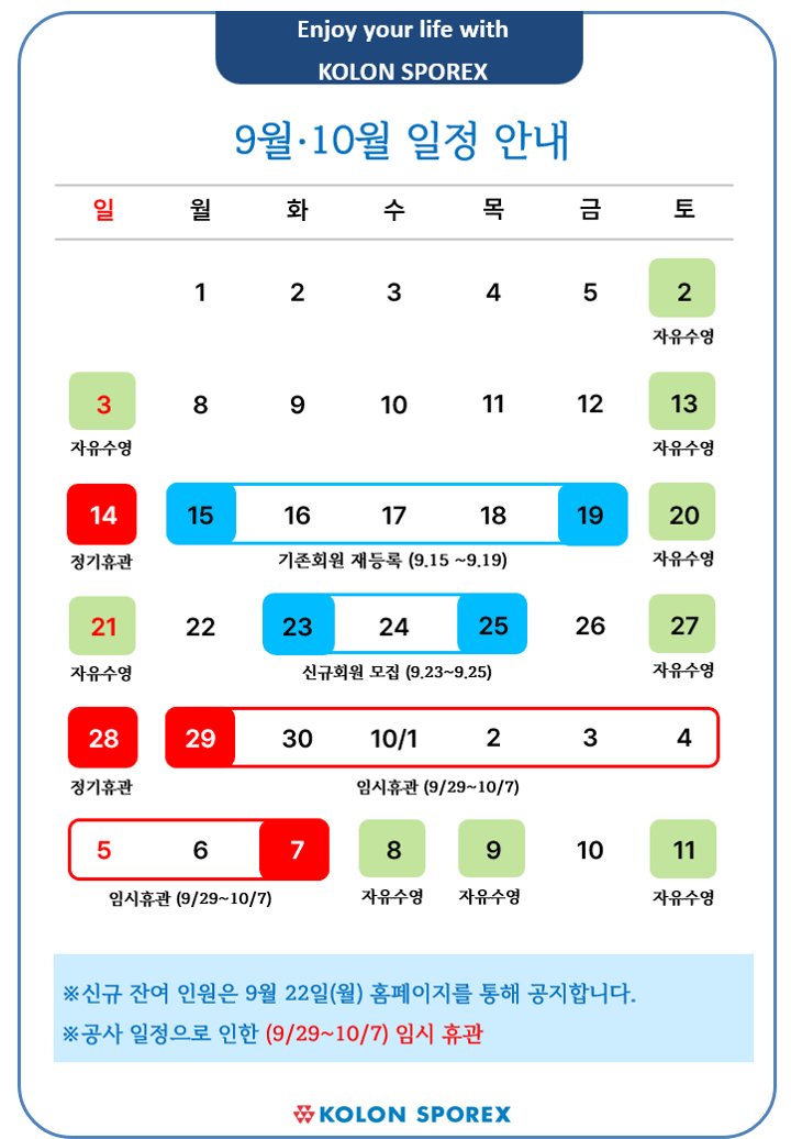 | 이전글 | 코오롱스포렉스 인천드림파크점 10월 회원 재등록 및 신규 등록 일정 |