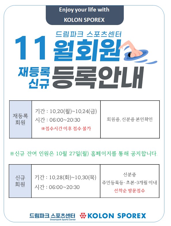 11월 회원 재등록 및 신규 등록 일정을 아래와 같이 안내 드립니다.
