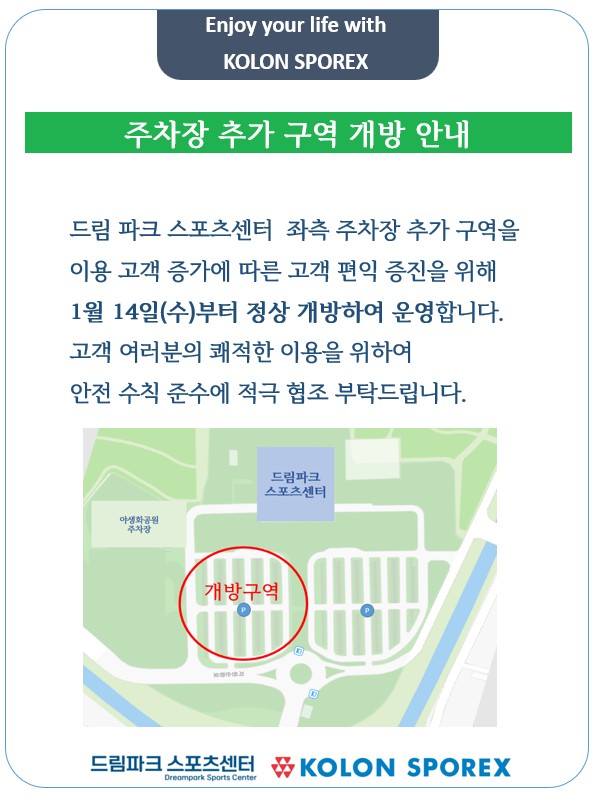 코오롱스포렉스 인천드림파크점 주차장 추가 구역 개방안내