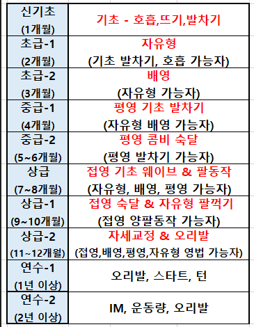 아래 진도표 참고 하셔서 강습반 등록 하시기 바랍니다.